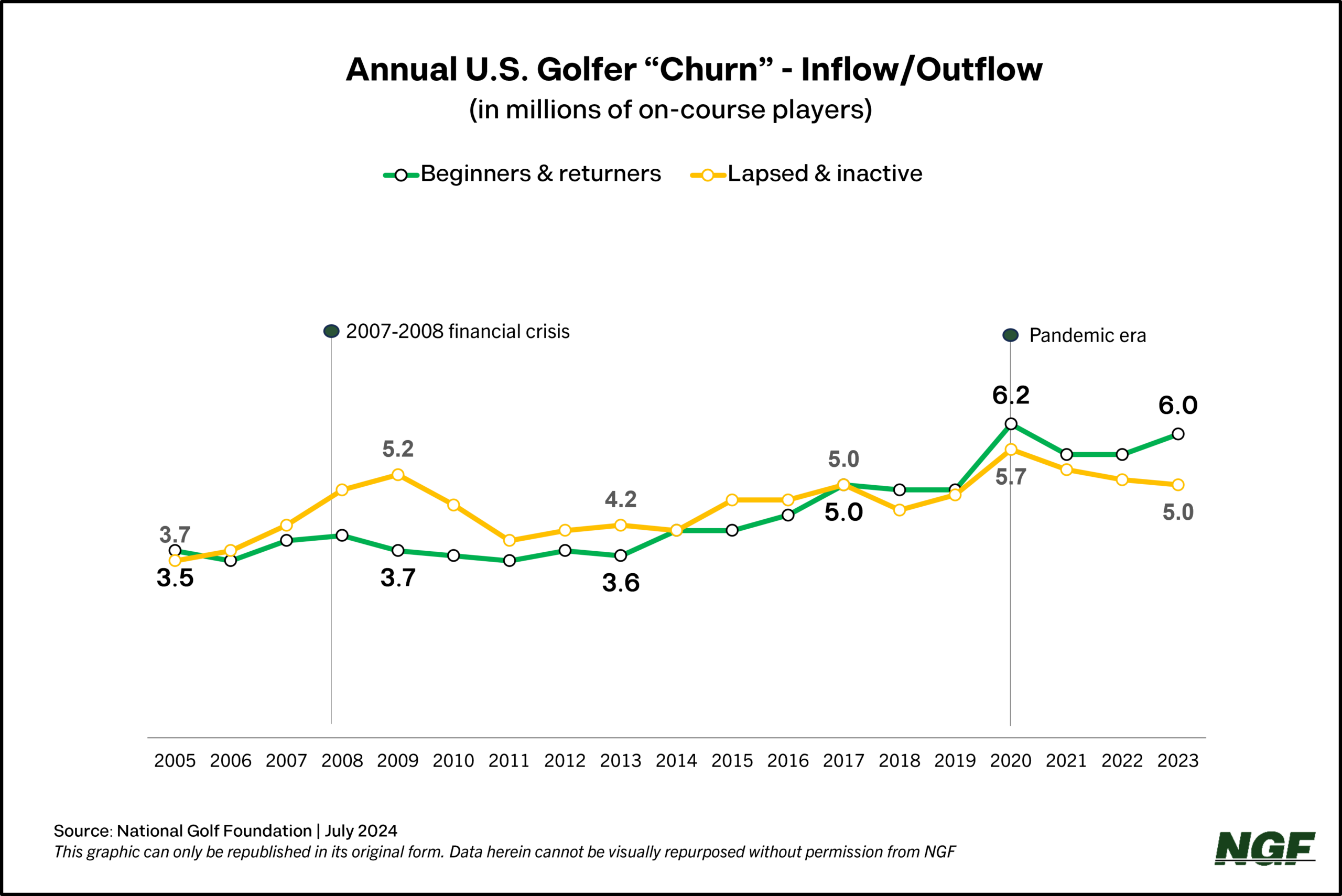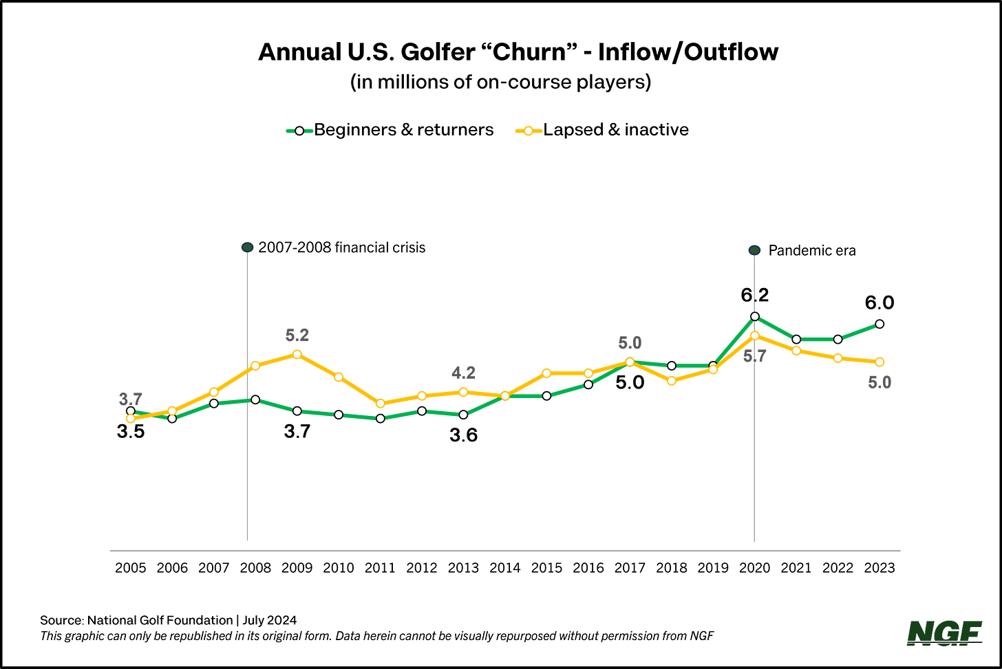 This shows up in the golfer data. The Covid pandemic saw a massive influx of golfers picking up the game. But historically, golfer outflows are pretty consistently even with golfer inflows. People get frustrated and churn out.