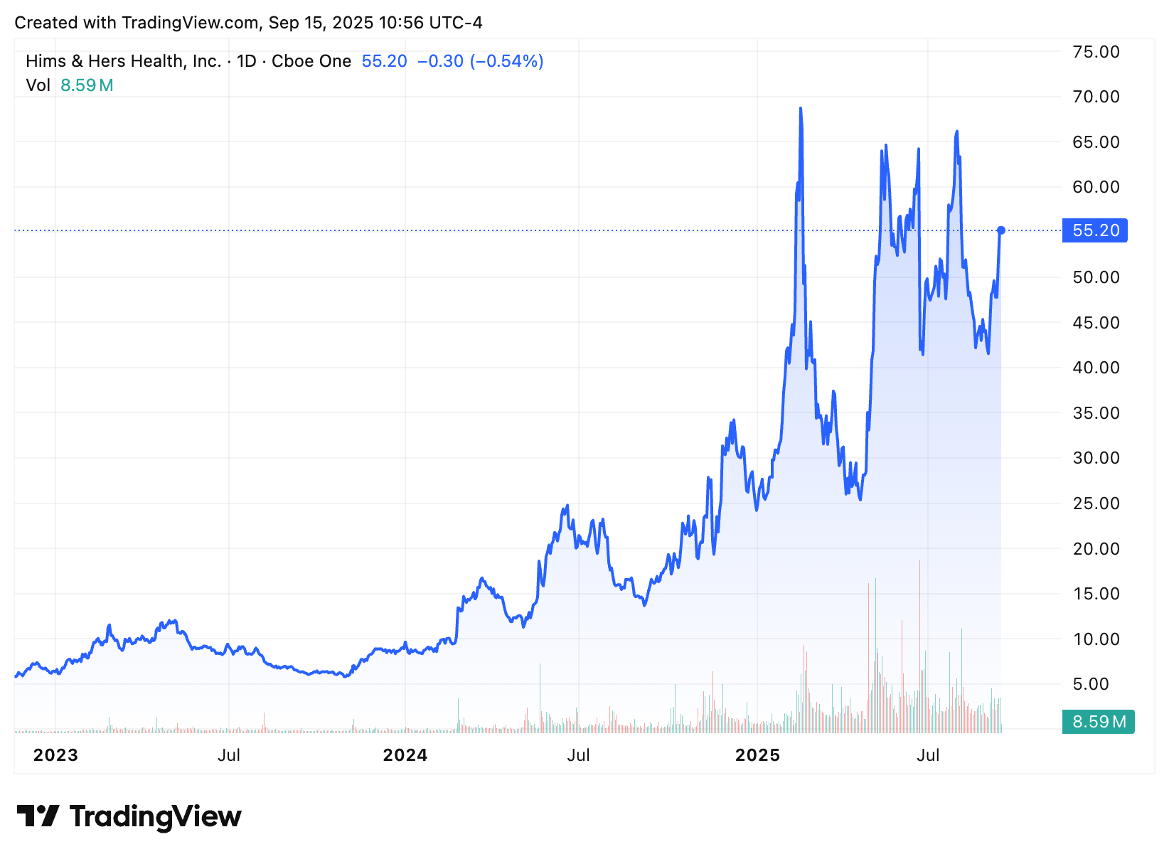 - Or, we can just look at HIMS 0.00%↑, which is now up 233% over the past year, primarily attributable to their ability to write personalized prescriptions including weight loss drugs.