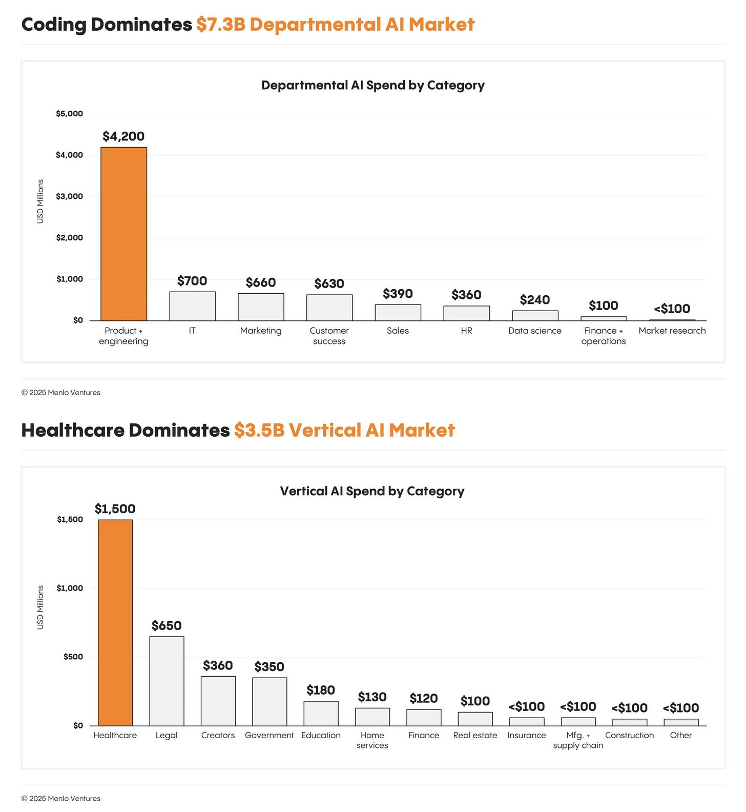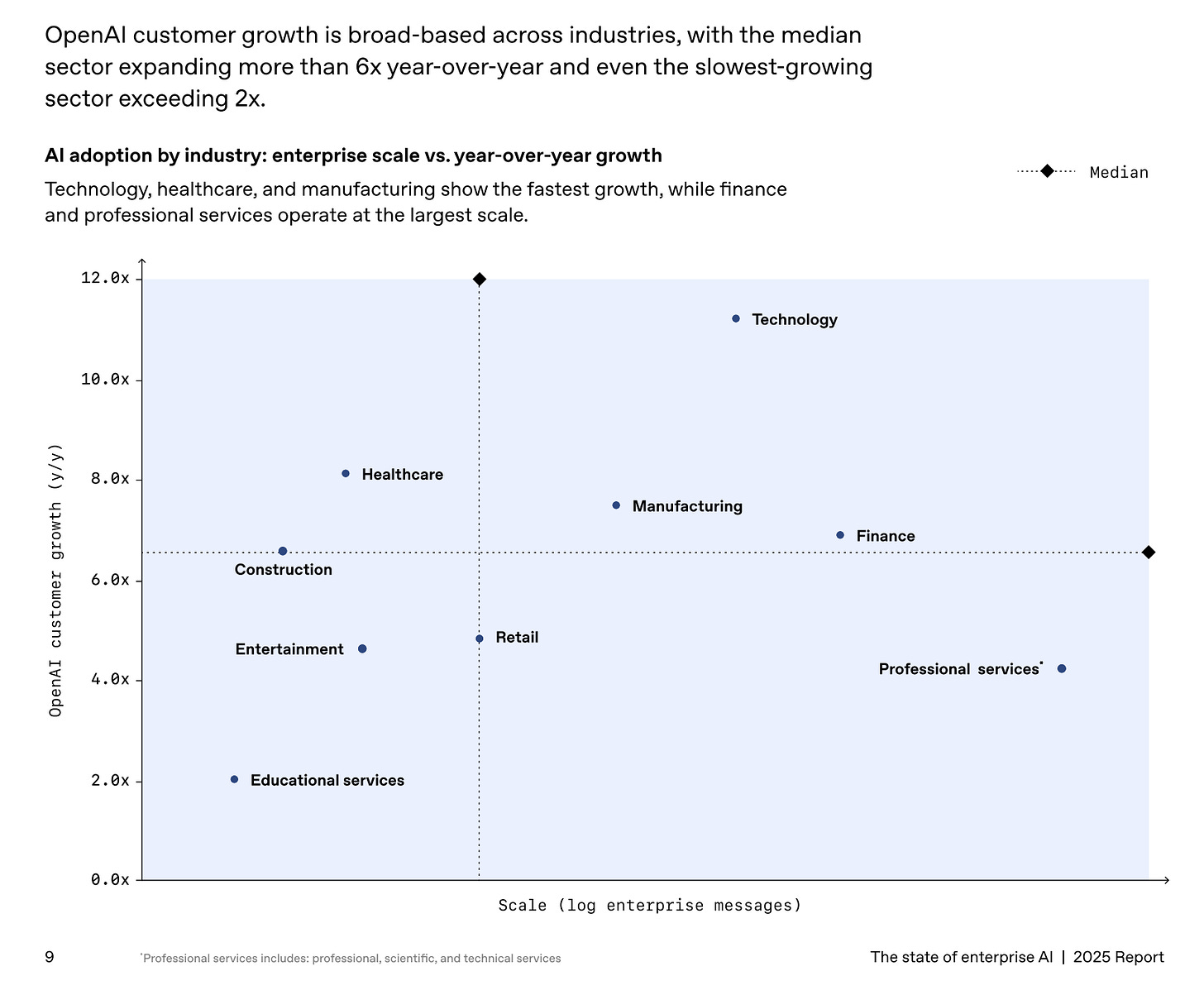 First, manufacturing looks like an industry ready for some breakout vertical AI solutions. Despite absolute dollars being low, the number of interactions with models inside the industry is growing well above the median.